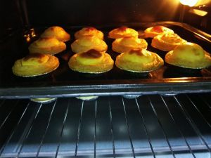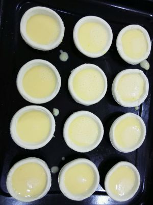 倒入蛋挞水,8分满,烤箱预热陈10分钟,放入烤箱中,上下管,220°中层,25分钟。