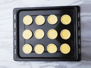 3、烤盘放入预热好的烤箱里面,温度210℃时间20—25分钟,挞皮金黄即可出箱