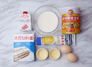 蛋挞皮8个 / 淡奶油80g / 牛奶72g / 糖粉24g / 炼乳8g / 鸡蛋2个 / 吉士粉8g