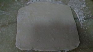 飞饼提前解冻,2张饼叠放在一起,撒干粉防粘。