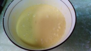 蛋黄打散加入细砂糖、牛奶、淡奶油、玉米淀粉混合均匀成为蛋挞液。