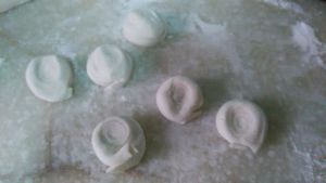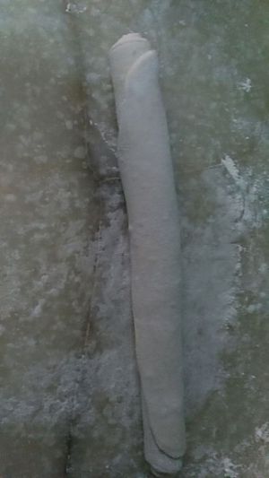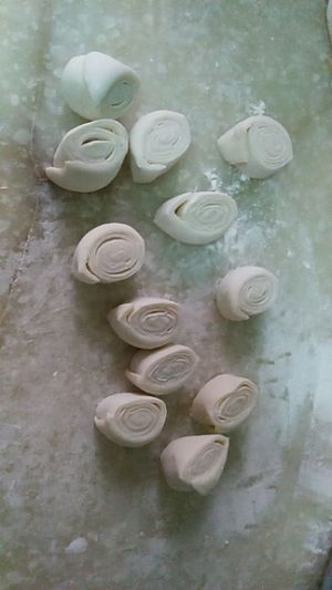 由下向上卷起要卷紧,成为方条形面卷,收口捏紧。