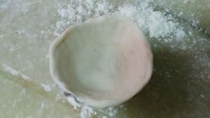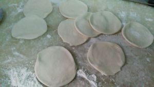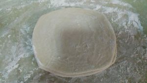 将面卷按扁,擀成圆形面片成为蛋挞皮。