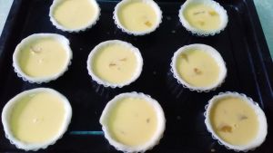 5.过筛后倒入蛋挞皮中,八分满即可。
