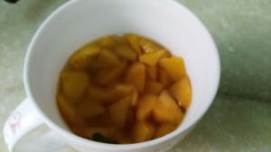 将蛋挞液加入模具中,8分满,加入黄桃丁。烤箱预热220度,烤盘放置中层,上下火烤20分钟左右,将烤盘移至上层,3-5分钟上色即成。