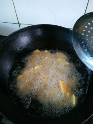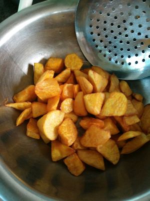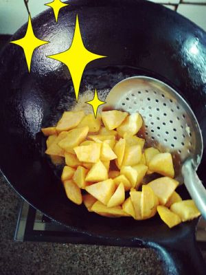 锅中倒油,小火,凉油放入地瓜快,慢慢炸至金黄,硬脆,捞出控油,备用。(炸制过程中小心不要被烫到哟)