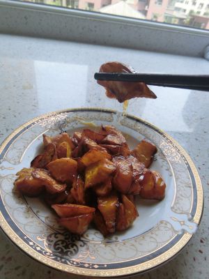 糖熬好,下炸好的地瓜,马上翻腾,要快,要不然就糊啦,最后关火,盛盘,成功啦。