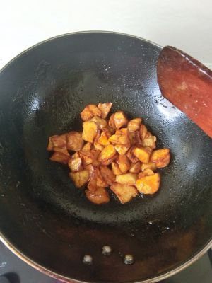 待糖形成金黄色,关火,把备用的地瓜倒入锅里快速翻炒,盛出即可,