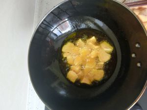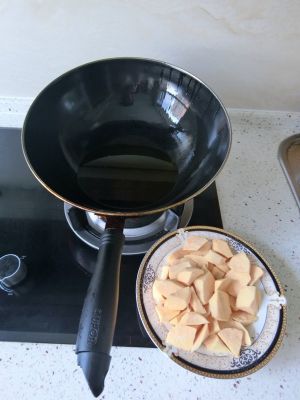把地瓜切成均匀的滚刀块,放入油里炸成金黄色,出锅备用