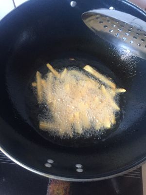 热油,地瓜条入锅炸至金黄外表变硬捞出