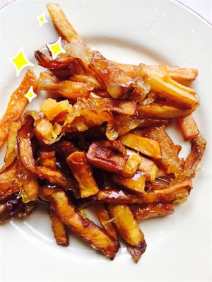 将炸好的地瓜块捞出备用。锅中留少许油,加入适量白糖,小火慢慢的翻炒,直到糖融化变色冒泡时,加入炸好的地瓜块快速翻炒几下使糖均匀的粘在地瓜块上。盛出即可。