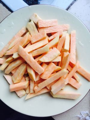 1、我地瓜切成滚刀块,然后下油锅炸一下!看着颜色变黄捞出即可!