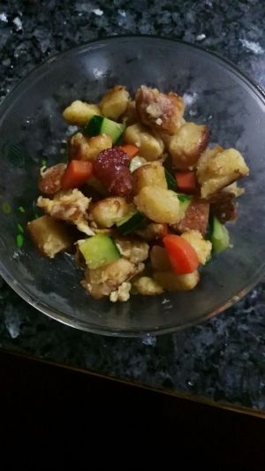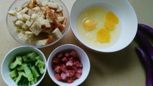 把黄瓜,香肠,吐司,胡萝卜切丁备用