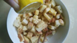 把吐司加入搅拌好的鸡蛋液中,略微放点盐,挤点柠檬汁去蛋腥,不加也可!