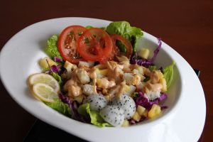 各种食材切丁,生菜铺底,撒上紫甘蓝丝,撒入食材,淋少许橄榄油,浇上千岛酱OK