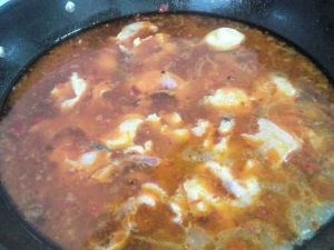 锅底加油放入糟辣子,豆瓣酱炒香,放入干辣椒、花椒继续炒最后放葱姜蒜,加世刚熬好的鱼汤小火熬3分钟,捞出辅料