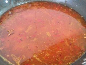 再加适量水,胡椒粉,十三香于锅中煮沸,过滤出渣料,只留汤