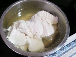 鱼骨铺垫盆底、将鱼片和汤倒入盆