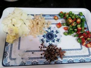 用到的佐料:冰糖,姜,蒜,泡椒,花椒,八角,青红椒,自制豆瓣酱和剁椒酱,胡椒粉,盐。