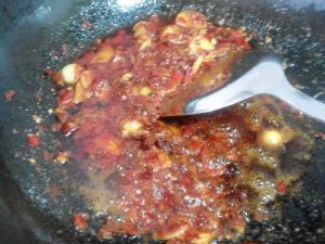 然后是豆瓣酱和剁椒酱,小火炒香并出红油。豆瓣酱可用郫县红油豆瓣酱代替,不吃辣的可控制豆瓣酱的用量