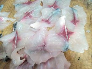 将鱼肉改刀切蝴蝶鱼片,我惯用的片鱼片,也可以直接片鱼片,随意
