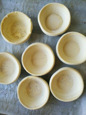 冷藏好后的面团取出,擀开,卷成卷,切剂子一样,切16等份(大小看蛋挞模具定的,16份是针对我的蛋挞模刚好适合),分好之后擀皮一样擀好放入蛋挞模具里,全部弄好之后蛋挞皮要醒最少十分钟或以上