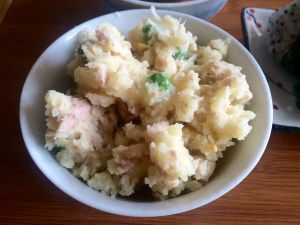 土豆用筷子可轻松插入时就表示熟了,捞出土豆趁热剥皮,稍微压成小块后加黑胡椒、盐和黄油压成土豆泥。(土豆泥入味一定要趁热!)同时,煮土豆的水不要倒,加一勺盐后煮玉米和青豆。