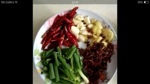 准备的大料:葱,花椒,八角,干辣椒,蒜,姜块拍碎。还有回香