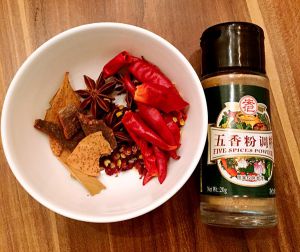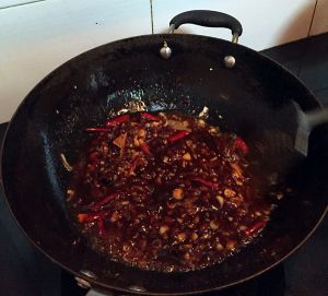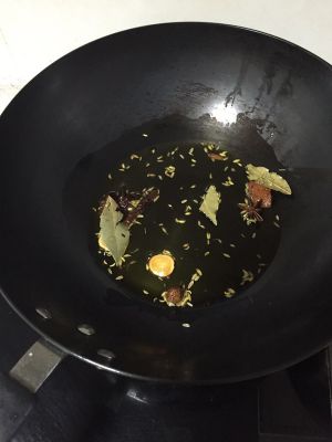 锅内倒油,下香料小火煸香。香料是(大料,桂皮,甘草,香叶,筚拨,小茴香),待香料发胀,捞出不用。