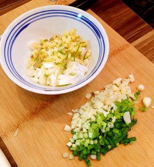 准备材料,碗里的用来炝锅,菜板上的最后加入爆炒