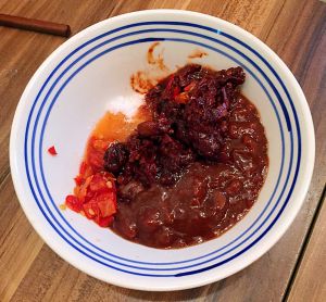 在酱中加入醋、料酒一点点,酱油一点点调成汁状