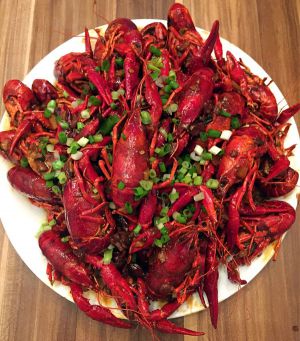 加入小龙虾加入五香粉和另一部分蒜和小葱