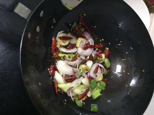 香料捞出后,下葱、姜、蒜、洋葱、干辣椒花椒炒香