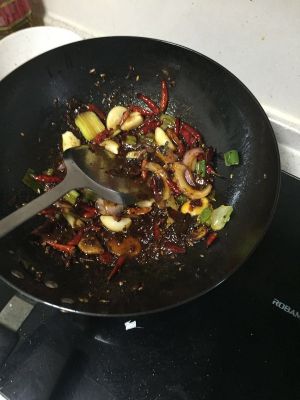 锅内留底油烧热,稍冷后放入葱、姜、蒜,干辣椒和调料,翻炒,加入盐、糖、料酒,放入炸好的虾
