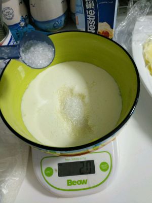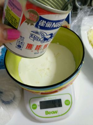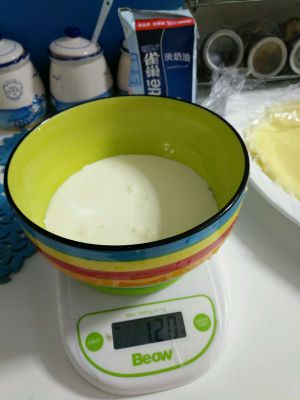 准备一个大碗放称上,先倒入淡奶油120克