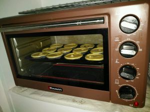 烤箱200度预热5分钟,把蛋挞放进去180度烤18到20分钟,蛋挞表面上色即可。
