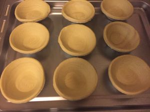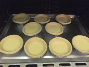 将刚才制作好的蛋挞水冷却后,倒入蛋挞皮,9分满