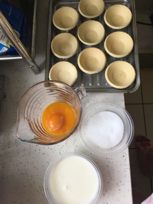 把所有材料准备好,糖放在牛奶里面搅拌到全部融化。蛋黄搅拌均匀后把牛奶倒入蛋黄里搅拌均匀。(自己吃过不过筛的都行)然后倒入挞皮内(蛋挞皮不用提前拿出来解冻),这个量倒满九个挞皮正好。