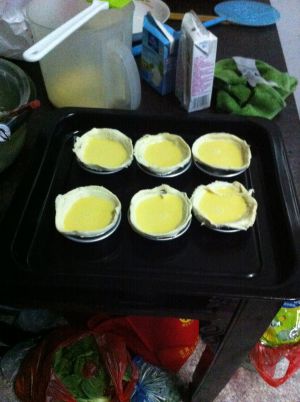 这次我是买的现成的挞皮,所以做起来很方便,把蛋挞皮提前半小时解冻,因为是和孩子一起做的,所以这有很多步忘了拍图了。