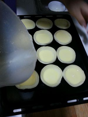 为了使蛋挞吃起来口感更好,所以我这次过了2遍过滤网,把蛋挞液倒入挞皮中,只要8分满就好,太多了容易发出来就都浪费了。