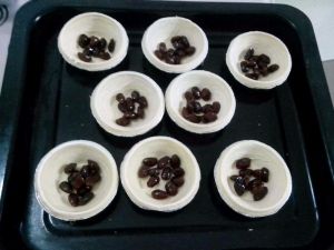 解冻后的蛋挞皮放入适量蜜豆。根据个人口味添加,也可以换成紫薯块。