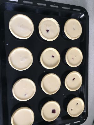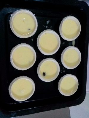 蛋挞液滤网过滤后倒入蛋挞皮内,8分满即可。