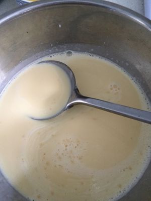 把蛋黄面糊倒入牛奶和淡奶油的混合液体