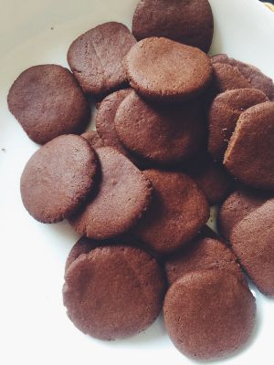 黄油切块室温软化后,加入糖粉,用打蛋器打至颜色泛白变软,这时候分次加入蛋液,继续打,直到蛋液与黄油完全融合。接下来分次加入面粉和可可粉的混合物,并用刮刀揉啊揉,直到变成面团。最后将面糊放进裱花袋,在烤盘上挤出曲奇的形状,可惜我被某宝卖家坑了,买回来的裱花嘴是小号!使了吃奶的劲也挤不出面啊啊啊,只好临时把曲奇变成了小圆饼的形状⋯⋯挤满一烤盘就可以放进烤箱啦~180度预热后,上下火烤13分钟左右,我看的别人分享的是要烤15分钟结果华丽的糊成了碳,第二盘就考了13分钟结果中心又没烤透,也是无奈了。总之这个方子纯属记录,大家最好还是别用了,待我仔细找找以前的那个方子再来分享T T