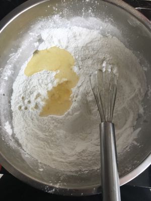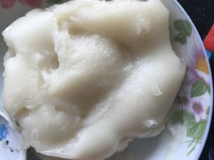将糯米粉 糖 玉米淀粉 一起倒入后搅拌 玉米淀粉不可多加 多加了糯米粉会没弹性