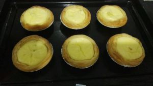 蛋挞液倒入挞皮,八分满,放入烤盘,烤箱220℃烤20分钟。