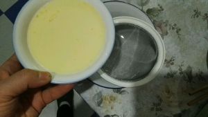 混合好的蛋液,经多次过筛,减少泡沫和杂质,保证蛋挞烤出来组织细腻光滑。