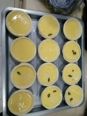 用筛子过滤后倒在买回来的蛋挞皮(大概34个蛋挞皮)放进预热好的炉