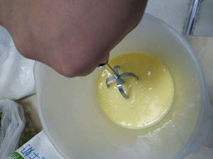 先将水和糖搅匀后 放牛奶和少许黄色素再搅匀,放鸡蛋用手动打蛋器搅匀