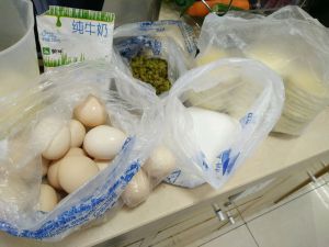 准备食材,鸡蛋,白沙糖,牛奶,挞皮,葡萄干